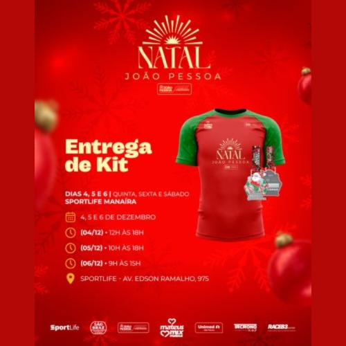 Natal dos Sentimentos Loja SportLife Av Édson Ramalho, 975, Manaira Dia 04/12/2025: 12h - 18h Dia 05/12/2025: 10h - 18h Dia 06/12/2025: 9h - 15h Apresente seu comprovante de inscrição + RG ou CNH Kit de terceiros: Comprovante de inscrição + foto ou cópia do RG ou CNH Kit PCD: Comprovante de inscrição + Laudo ou Carteira Funad + RG ou CNH Kit Idoso (60+): Comprovante de inscrição + RG ou CNH. Somente o titular da inscrição poderá fazer a retirada do kit atleta (vide regulamento) |