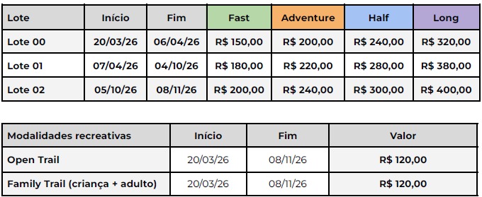 O Lote 00 (lote promocional) de inscrições da TRun – Trail Run Series | Etapa Caruaru 2026 terá início em 20 de março de 2026, sendo automaticamente encerrado em 06 de abril de 2026 ou quando atingido o limite de 300 (trezentas) inscrições, prevalecendo o que ocorrer primeiro.